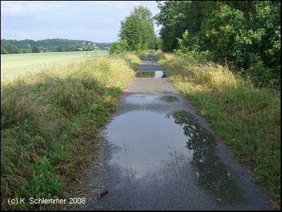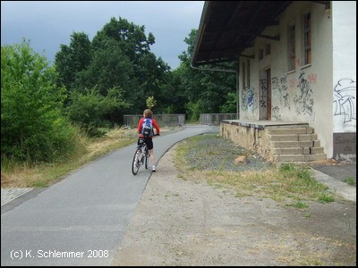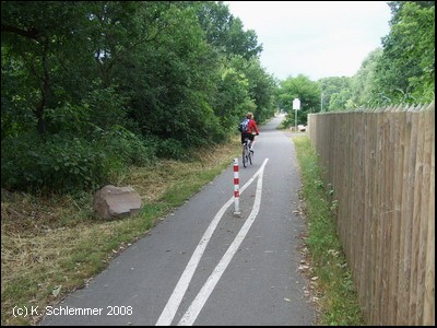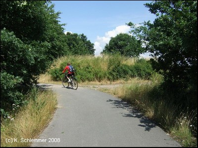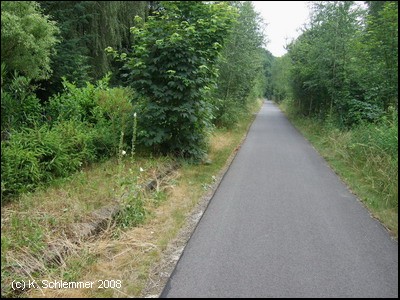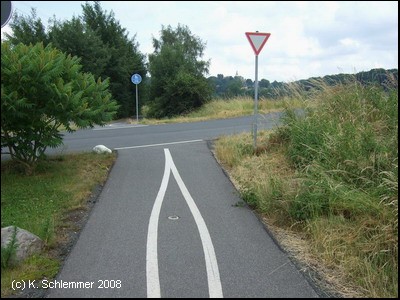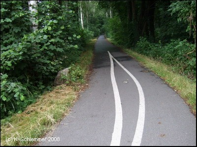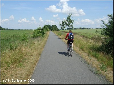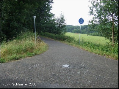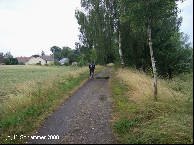 ....dann das abrupte Ende des Radweges auf der Bahntrasse. In einer Kurve geht es auf einem asphaltierten Radweg durch die Felder.