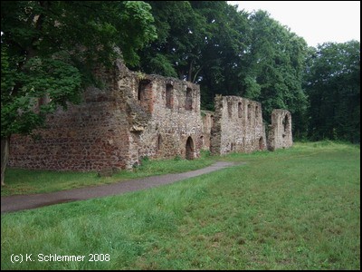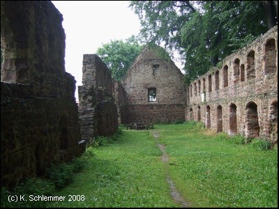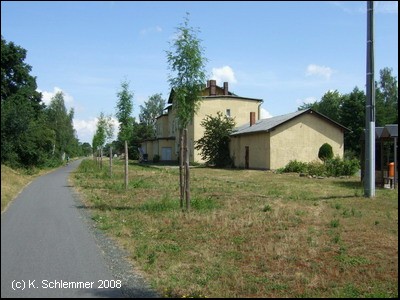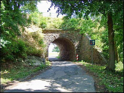 Zum Kloster Nimbschen. Kurz vor der Klosterruine, an einem alten Bahnwärterhaus muss die Trasse für ein paar hundert Meter umfahren werden. Hinter den Mauern des ehemaligen Zisterzienserinnenklosters verbrachte Katharina von Bora, die Ehefrau Martin Luthers, einen Teil ihrer Jugend.