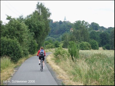 Am Hotel Kloster Nimbschen geht es wieder auf die Bahntrasse.