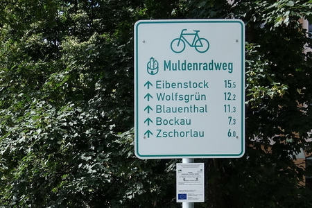 Dort findet man Infotafeln und Entfernungsangaben. Man folgt dem Logo des Mulderadwegs.
