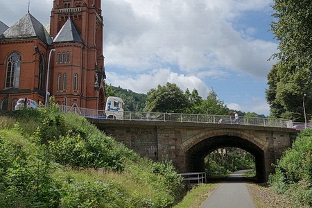 Schon der erste "Tunnel", ein Straßendurchlass (B101) an der Pfarrkirche St. Nicolai in Aue. Auf der breit asphaltierten Trasse geht es leicht bergauf Richtung Auerhammer.