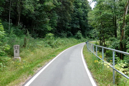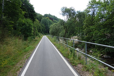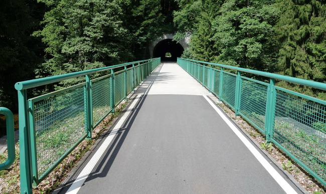 An einem kleinen Parkplatz findet man Informationstafeln zum Radweg. Die Straße muss überquert werden, es geht wieder auf die Bahntrasse. Noch eine Brücke, dann endete im Sommer 2015 der Radweg bei Wolfsgrün an der B 283.