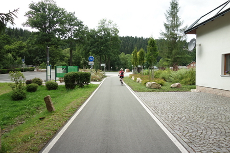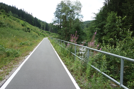 Bei unserer Fahrt im Jahre 2015 endete der Ausbau auf der Bahntrasse der B283 in Wolfsgrün, der Weiterbau zur Sperrmauer der Talsperre Eibenstock ist geplant.
