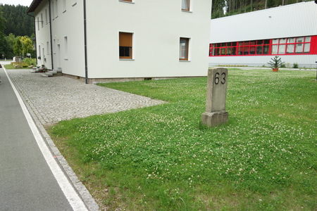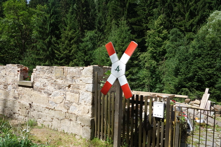 Kilometrierung und einige Eisenbahnrelikte findet man am Rande der Trasse, wie hier an einem Bahnwärterhaus.