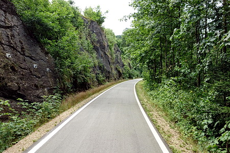 Am Rastplatz Bockau geht es durch einen felsigen Einschnitt. Hier überquert die B283 den Radweg und den Fluss.