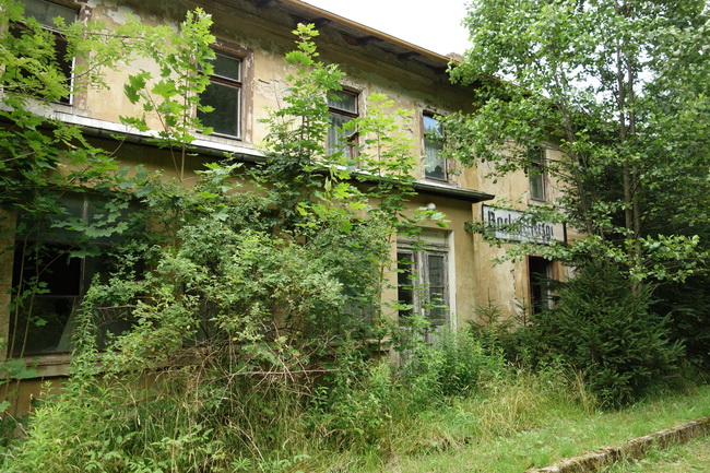 Kurz darauf erscheint der Bahnhof Bockau hinter dichtem Gestrüpp.