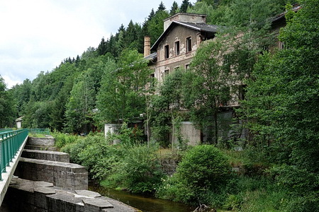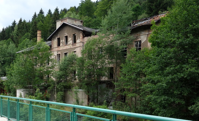 Auf der anderen Seite des Flusses steht die Ruine der Pappefabrik Schindlerswerk.