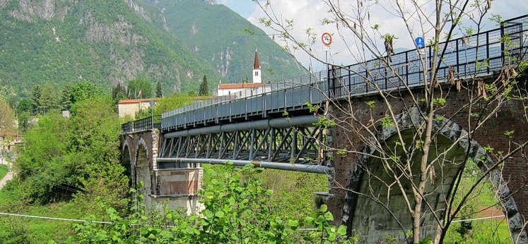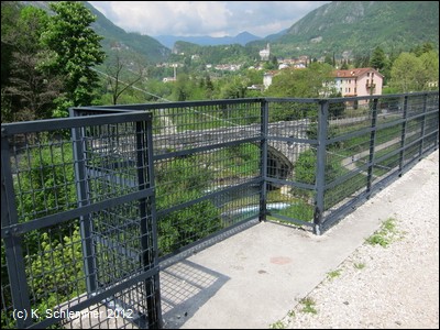 In einer Kurve geht es auf Arsiero zu, zunächst über eine gemauerte Brücke, dann über ein Stahlträgerviadukt über den Fluss Posina.