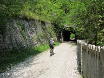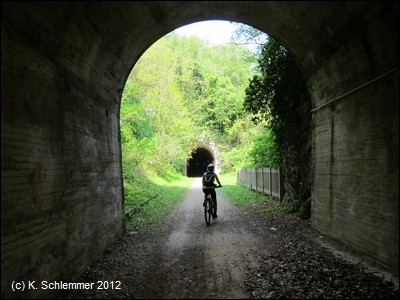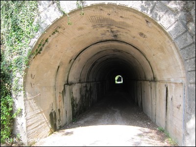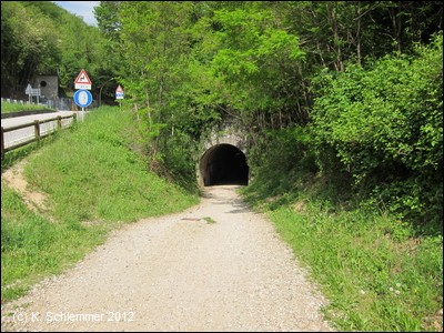 Infotafeln zeigen uns, dass wir hier richtig sind - aber da ist ja auch schon der erste Tunnel (Rocchetta - 110,15 m lang steht auf einer Tafel am Portal!)