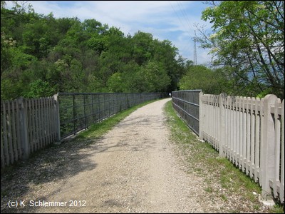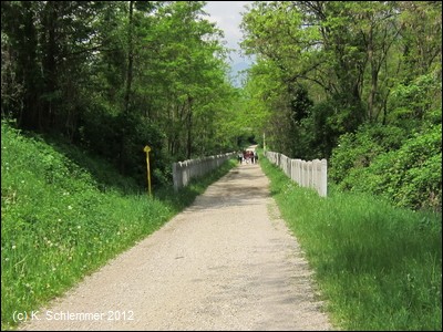 Manche nutzen die Trasse auch als Wanderweg. Vor Seghe di Velo überquert man mehrere kleine Brücken und eine weitere Straßenkreuzung.