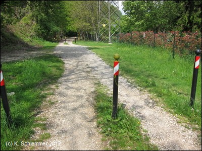 Auch ein Parkplatz mit Zugang zum Radweg liegt an diesem Streckenabschnitt. Das Streckenhäuschen (Casello No. 6?) ist in einem desolaten Zustand, der Dachstuhl ist eingestürzt.