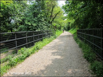 Der Zugang zum seitlichen Fenster-Durchbruch in diesem Tunnel ist vergittert. Nach dem Tunnel ist der felsige Abschnitt zu Ende (Blick zurück).