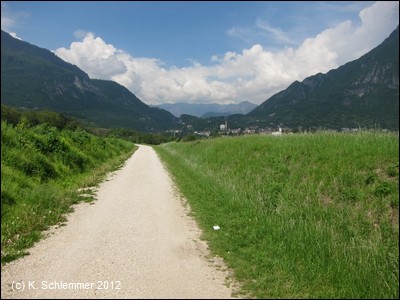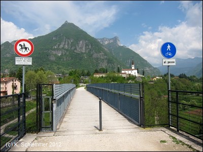 Noch vor Erreichen der Brücke über den Astico-Fluss links von der Straße abbiegen (Via A. Rossi). Die SP79 wird überquert. Hier beginnt der Radweg.