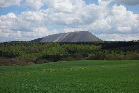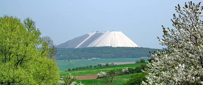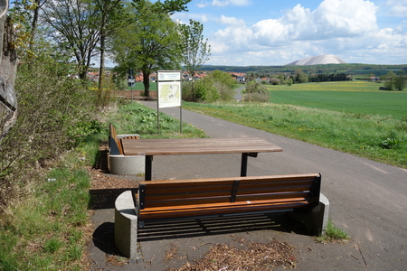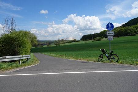 Der Radweg verlässt nun die alte Bahnstrecke und führt durch die Felder. Der Kaliberg kommt näher.