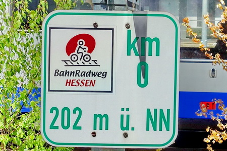 Im Frühjahr 2009 wurde der Solztalradweg als Teil des "BahnRadweg Hessen" mit eigenem Logo ausgeschildert, hier befindet sich der Kilometer Null . Vom Parkplatz auf der stadtabgewandten Seite des Bahnhofs (Heinrich-Börner-Str.) fährt man in nördlicher Richtung entlang der aktuellen Bahnstrecke.