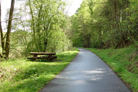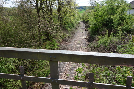 Der nächste Halt ist Lampertsfeld, mit einer Ruhebank! Dann, plötzlich, ist die Fahrt auf der Trasse zu Ende.