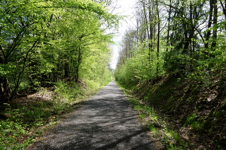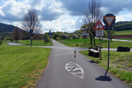 Neben dem Schotterbett der alten Trasse folgt man dem asphaltierten Weg bis zur Kuppe am Ortsrand von Schenklengsfeld.
