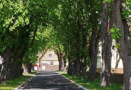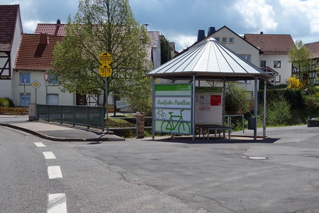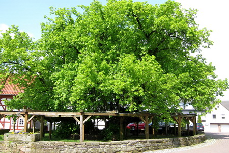 Der Radfahr-Pavillon steht an der Straße, nicht gerade idyllisch, aber ein guter Schutz bei Regenwetter. Die uralte LInde im Ortszentrum sollte man jedenfalls nicht übersehen. Über das tatsächliche Alter wird noch diskutiert, mindestens 600 Jahre, wahrscheinlich aber um die 1200 Jahre soll der Baum schon leben.