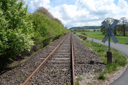 Stetig leicht bergauf führt die Strecke zur Bahnbrücke bei Wehrshausen. Vor dem alten Haltepunkt muss die Bahnlinie überquert werden.