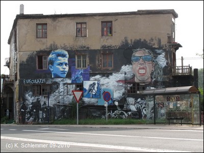 Graffitikünstler haben sich um Verschönerung der alten Häuser bemüht. Vorbei an den Villen aus verganger Zeit nähern wir uns dem Bahnhof von Lezo/Errentería (span.: Renteria).