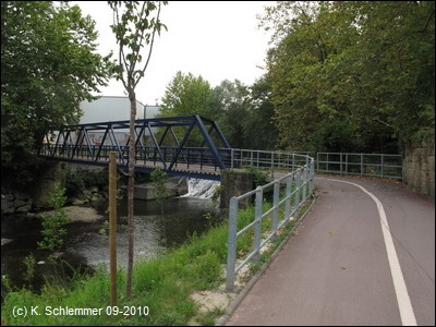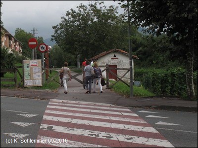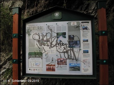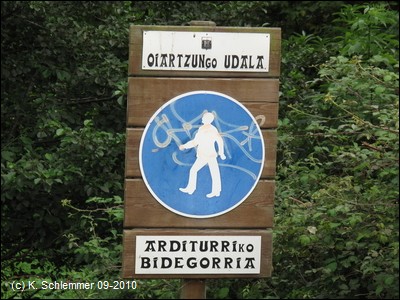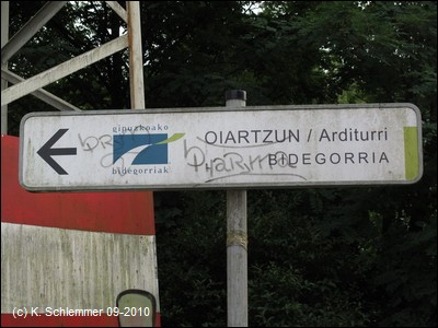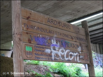 Dann, direkt unter der Autobahnbrücke am Flussufer des Oiartzun, steht unvermittelt das Schild vor uns: Vía Ciclista, bereits von Sprayern "verschönert". Auf einer Metallbrücke überquert der Radweg den Fluss.