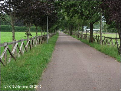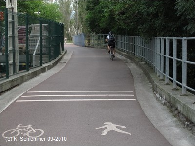 Dann ein Wegweiser, wir sind auf dem richtigen Weg. Ein breiter Radweg führt an einem Industriegelände vorbei.
