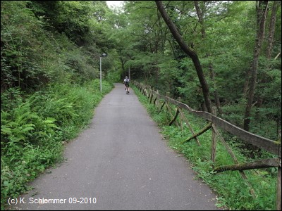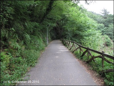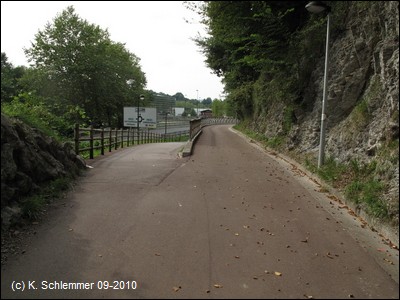 Die Straße wird überquert, es geht nun etwas stärker aufwärts. Die Bahntrasse ist unverkennbar.