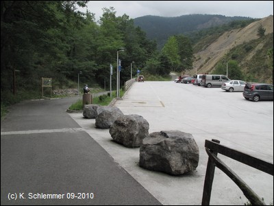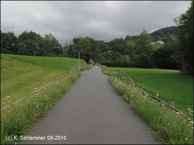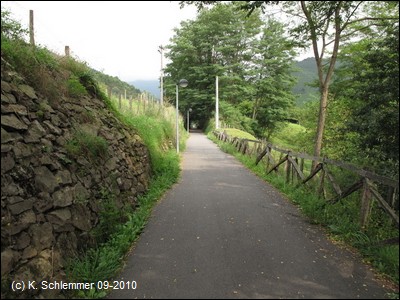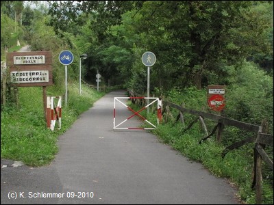 Eine lange Gerade bringt uns zu einem Abzweig, die Beschilderung ist zweideutig: Radwegschild links, Fußwegschild rechts. Hier muss man rechts im Tal bleiben und nicht links den Berg hinauf!