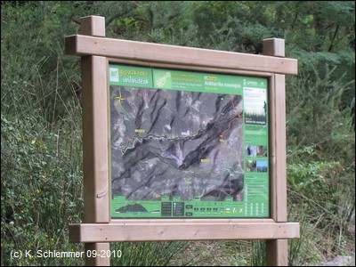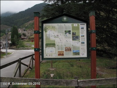Hier steht noch einmal eine Informationstafel und ein Wegweiser zu den alten Eisenminen.