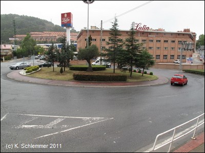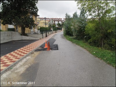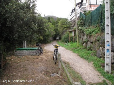 Der Radweg beginnt gut "versteckt" an einem Kreisverkehr im Südosten der Stadt nahe der Zufahrt zur Autobahn A-8 über die N-634. Uns hat ein freundlicher Autofahrer den Weg gezeigt. Eine Treppe (!) führt hinauf zum Radweg.