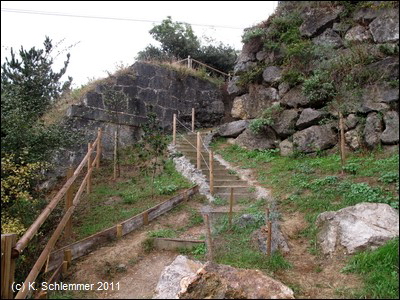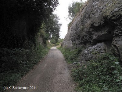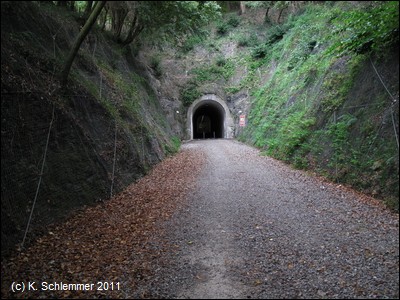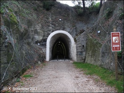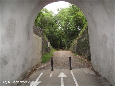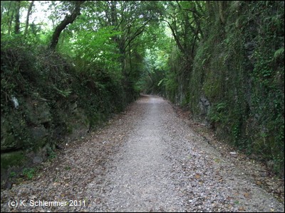Nun sind wir wieder in der Natur, eine Felswand und Befestigungsmauern begrenzen die alte Minenbahnstrecke.