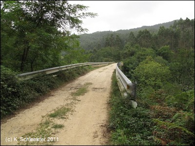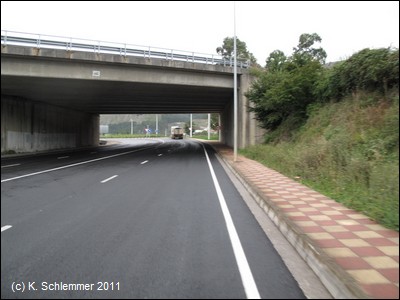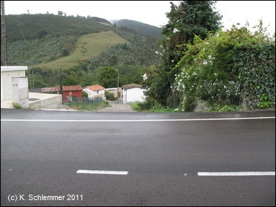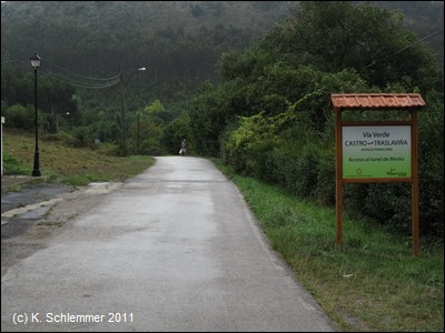 Die Autobahn A-8 hat die Trasse zerstört, eine Beschilderung sucht man vergeblich (Stand 2011) . Wir folgen der Straße in den Ort Santullan. Hier ist der Straßenneubau (Tunnel) noch nicht abgeschlossen. Ein Sträßchen führt wieder hinab auf die alte Bahntrasse (2011 noch keine Wegweiser).