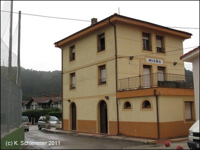 Am Sportplatz erreicht man den alten Bahnhof von Mioño, heute Wohnhaus. Die Strecke weiter in Richtung auf die Berge zu. Der Steinbruch von Santullan, weithin zu sehen, hat den halben Berg verschlungen.