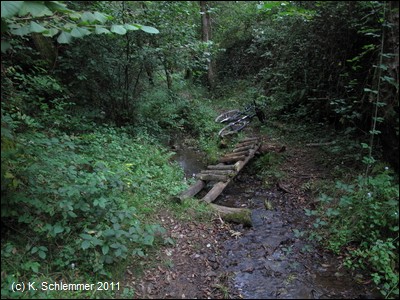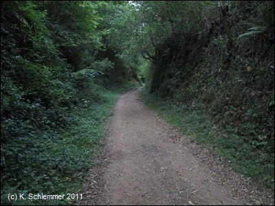 Vorbei an den letzten Häusern der Stadt erreicht man den Wald. Dies ist ein schöner Abschnitt des Radwegs auf der alten Bahnstrecke.