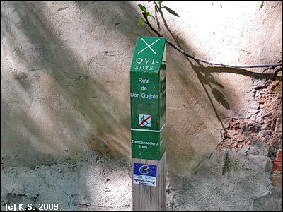 Hauptsächlich die Wegweiser der Ruta de Don Quijote begleiten uns im ersten Abschnitt. Manche Pfosten haben auch Kilometerangaben.