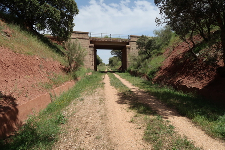 Die Trasse verschwindet in einem Einschnitt, eine kleine Brücke kommt in Sicht. Ein Weg biegt nach links ab, die letzte Chance die N-322 zu erreichen.