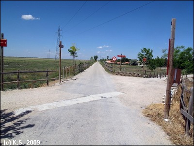 Die Beschilderung ist marode, der Weg ist Teil der Ruta de Don Quijote, die nach der Brücke rechts abbiegt und weitab der Bahntrasse durch die Felder führt.