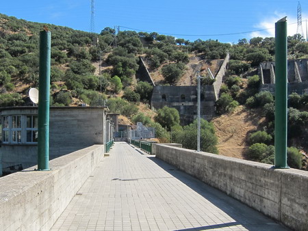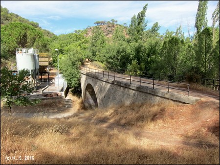 In der Gegenrichtung kann man der Trasse über die kleine Brücke noch ein Stück folgen, aber noch vor der Straße übernimmt das Dickicht! Der Radweg aber führt weiter flussabwärts. Der Blick zurück über den Fluss lässt noch die Staumauer des höher liegenden Stausees von San Juan erkennen.