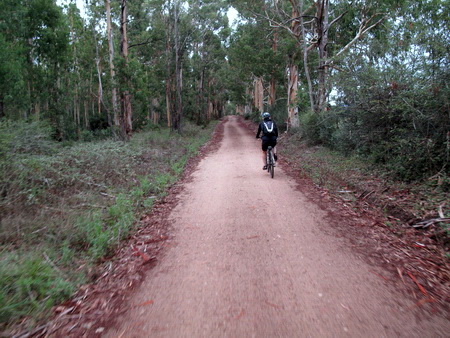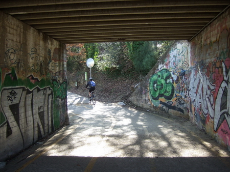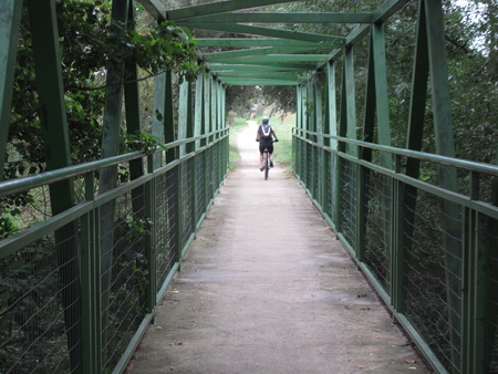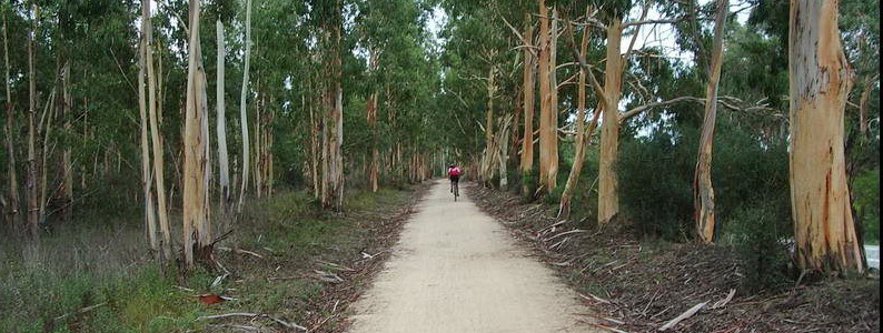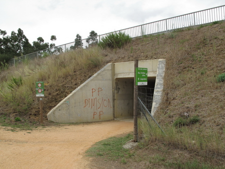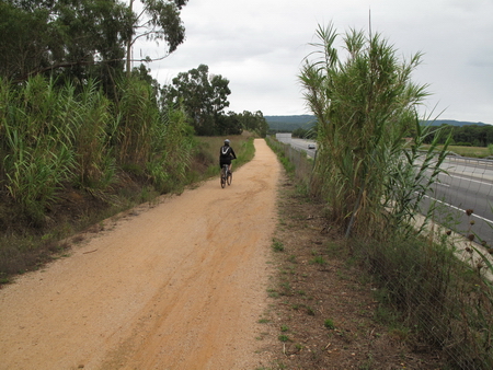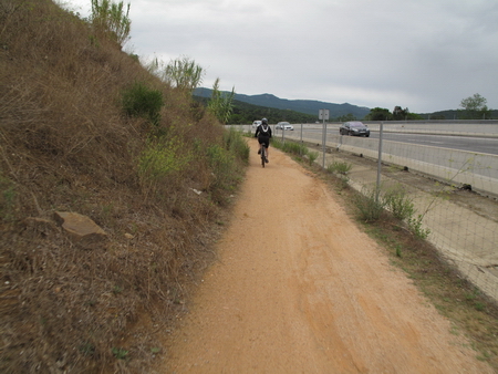 Die Baustelle an der C-35, die vormals den Radweg blockierte, ist verschwunden. Ein Durchlass führt unter der Querstraße durch. Entlang der Straße radelt man durch einen Eukalyptuswald.