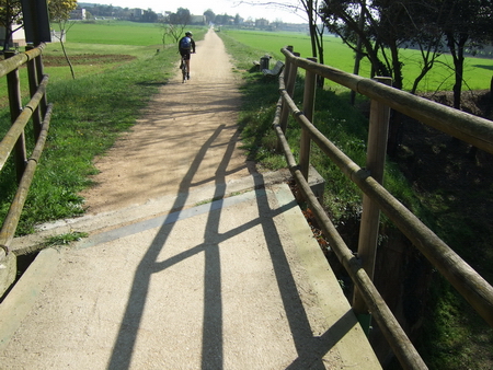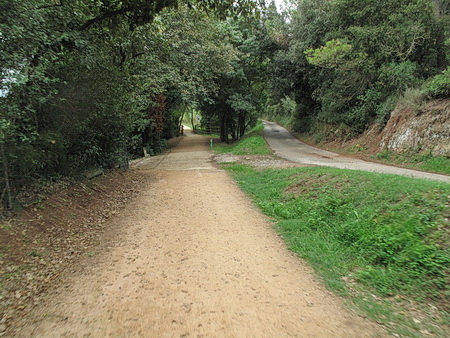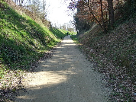 Der Radweg Richtung Quart, links halten! Die Fahrbahn ist (bei Trockenheit) gut zu fahren, aber nicht asphaltiert. Durch den Ausbau der Nationalstraße wurde die Trasse unterbrochen. In einer Schleife geht es unter der Straße durch und auf der restaurierten Bahnbrücke über den Onyar.