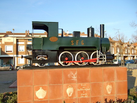 Hier steht auch ein Lokdenkmal (1982) zur Erinnerung an die Bahnstrecke. Im Zickzack geht es durch den Ort, dann unter der C-65 durch.