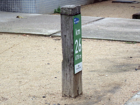 An einem kleinen Park endet die Fahrt auf der Bahntrasse. Eine Kehrtwendung um den Park herum führt abwärts zum Hafen. Die improvisierten Schilder helfen weiter (2013).