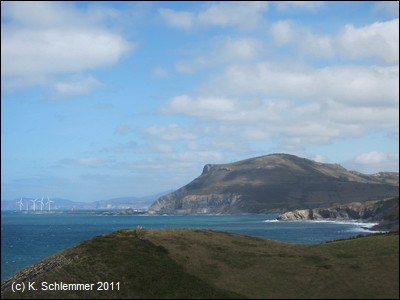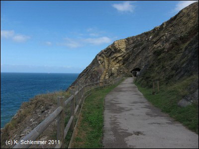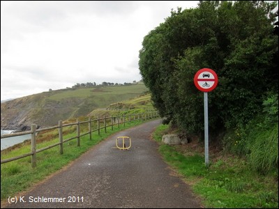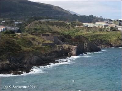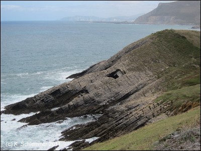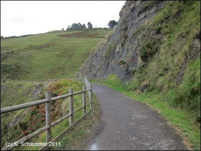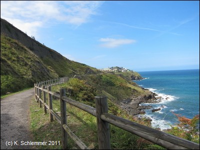 Die asphaltierte Trasse führt direkt an der Steilküste entlang in einer Höhe von über 40 m über dem Meer. In der Ferne ahnt man die Bucht von Bilbao.