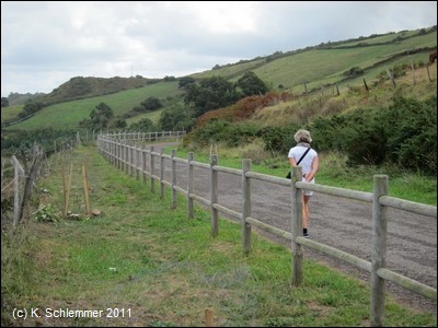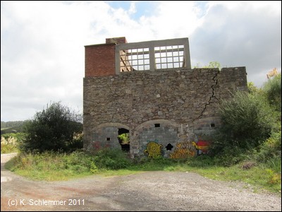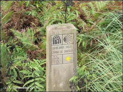 Die Reste der alten Grube. .....und ein Schild des Jakobswegs. Von hier aus in östlicher Richtung liegt die Bucht von La Arena (Vía Verde Montes de Hierro). Über die Via Verde.. Paseo de Itsaslur, die nur knapp einen Kilometer weiter beginnt, erreicht man nach 2,2 km den Strand und den Radweg in die Bucht von Bilbao.