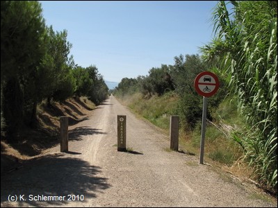 Die Benutzungsanleitung für die Vía Verde erinnert eher an deutsche Bürokratie: immerhin, Höchstgeschwindigkeit 20 kmh und nicht 10 kmh wie sonst üblich! Durch einen Schilfgürtel geht es stadtauswärts.