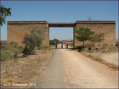 Einfahrt ins Bahnhofsgelände von Malón. Das Bahnhofsgebäude ist eine Ruine.
