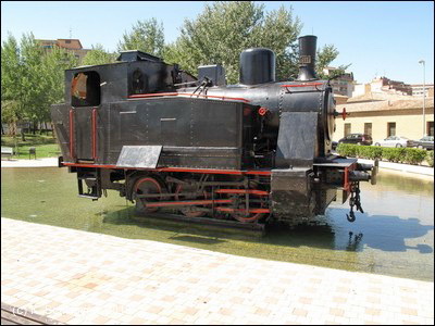 An einem Park links des Weges steht eine alte Lokomotive. Auf dem grünen Radweg erreicht man schnell den Bahnhof von Tudela.