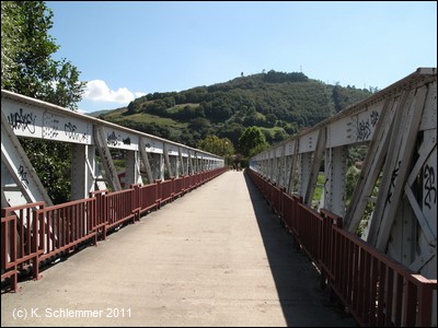Ein tiefer Einschnitt liegt hinter uns. Die Eisenbrücke mit den alten Loren hat eine merkwürdige Form: Die Konstruktion ist eckig, die Gleise sind aber (natürlich) in einem Bogen verlegt.