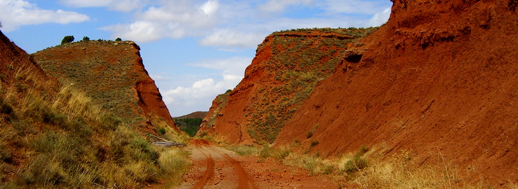 Von der Passhöhe hinab ins Tal des Flusses Alfambra führt uns der nächste Abschnitt. Es geht auf einer Splitt-Asphalt-Decke gemächlich abwärts, über etliche Brücken und Viadukte und durch Tunnel. Zunächst führt die Strecke noch durch ein Waldgebiet, dann aber durch eine schroffe Felslandschaft mit tiefen Einschnitten. Die tiefrote Erde wird von Gräben und Schluchten durchfurcht, die das extreme Klima dieser Region über die Jahrhunderte geschaffen hat. Den Radler erwartet eine einsame Landschaft, da die durch Abwanderung dezimierten Dörfer abseits der alten Minenbahn liegen. Am Ende dieses Abschnitts erreicht man Teruel (915 m ü.NN), das fünf Kilometer von der Vía Verde entfernt ist und sich als Etappe für die Übernachtung hervorragend eignet. Die Stadt, die oberhalb zweier Flüsse liegt und deren Stadtteile durch Brücken verbunden sind, lohnt in jedem Fall einen Besuch.