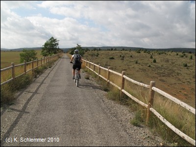 Und wieder tiefe, felsige Einschnitte in die Landschaft. Ein Rastplatz mit einem Brunnen und den originellen Fahrradständern am Wegesrand.